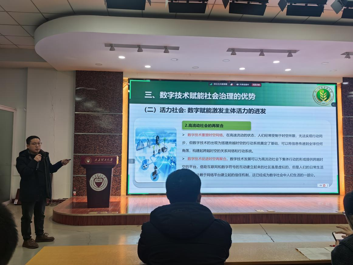 接下来,李卓副教授介绍了数字时代的九大基本特征,并指出“大数据会带来负面影响,大学生不要频繁使用抖音等娱乐软件,被数据建构的信息茧房所限;大数据、人工智能要根据每个人需求的多样性和差异性,求最大公约数”;他谈到了数字社会治理中的秩序与活力的平衡问题,“高秩序——高活力”是最理性的类型;他分析了数字赋能社会治理的优势和局限,探索了数字社会治理中实现“秩序——活力”平衡的线上线下路径;最后指出我们要找回数字赋能社会治理的温度,通过多元渠道及时回应群众的需求与呼声,将以人为中心的价值理念落实到位。