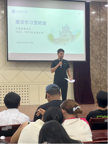 2024年9月19日,为了进一步增强行政管理专业同学的学习积极性和主动性,建设良好的学习氛围,行政管理专业2022和2023级召开了“建设学习型班级”主题班会。会议由王斌老师主持,杨光耀老师出席,行政管理2022和2023级同学和2021级优秀学生代表参加。