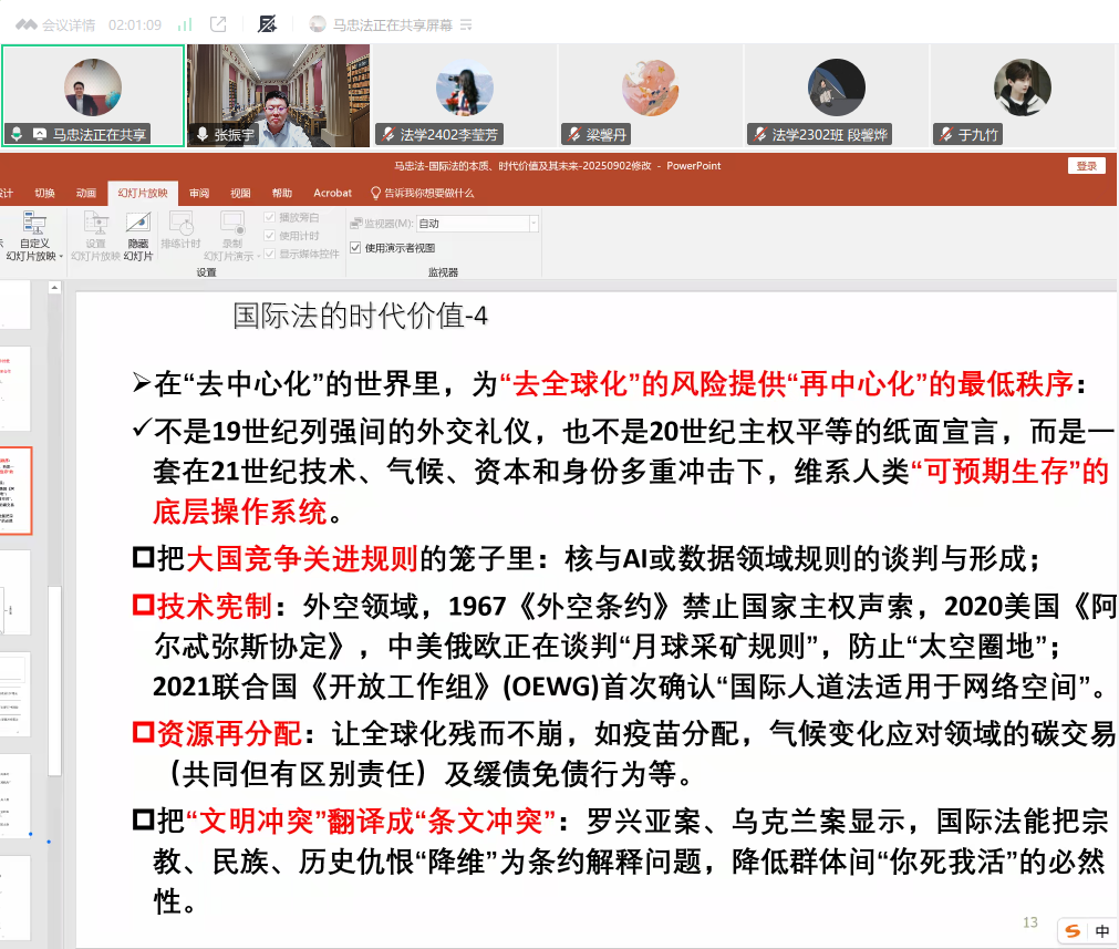 在总结环节,张振宇表示,马忠法教授具有多年的涉外法治教学和实务经验,讲座内容具有很高的理论深度。整场讲座彰显出“国际法从主权博弈工具转向人类命运共同体的契约化载体,我国努力通过发展权优先、共商共建共享等理念重塑国际法合法性基础”的中心思想。通过学习,让大家对于国际法的本质、时代价值与未来发展的认识和理解更为清晰。