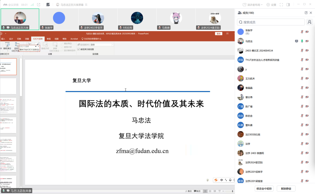 为深入学习贯彻党的二十届三中全会精神,提升涉外法治人才培养水平,9月9日,bat365正版唯一官网邀请复旦大学法学院博士生导师马忠法教授以《国际法的本质、时代价值与未来》为题作专题讲座(线上)。学院师生180余人参加讲座,法学系党支部书记、博士生导师张振宇主持讲座。