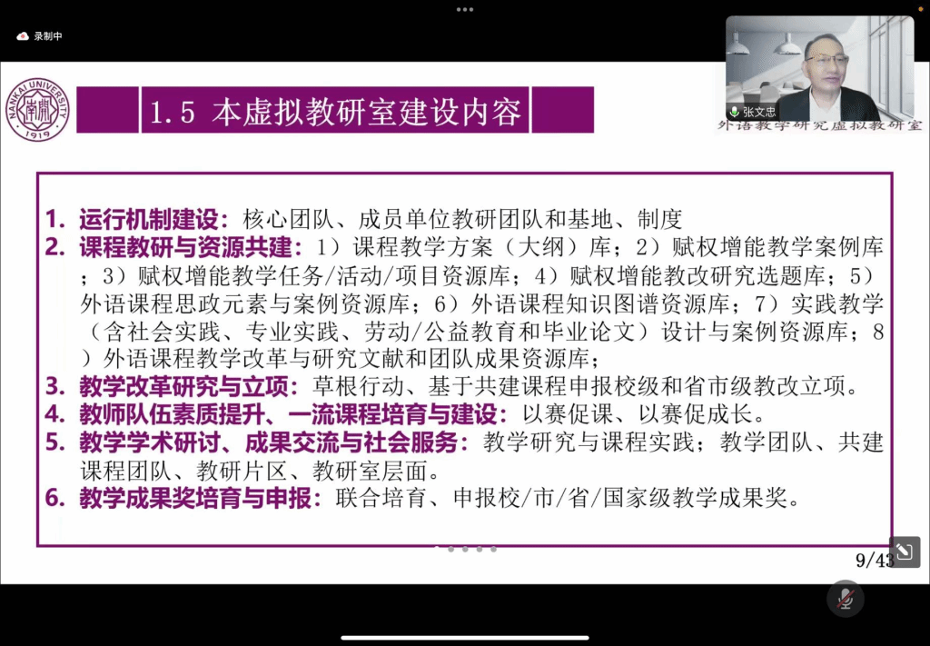 张文忠教授首先介绍了当前国家高等教育的新发展现状,并强调虚拟教研室是高等教育高质量发展的重大举措之一。自2021年教育部发布了开展虚拟教研室试点建设工作的通知以来,外语类虚拟教研室的建设已有32家试点。张文忠教授指出,虚拟教研室建设标志着外语课程建设已进入新发展阶段,改变了以往线下“单兵作战,单打独斗”的现象,实现了线上线下结合、跨校共建共享。