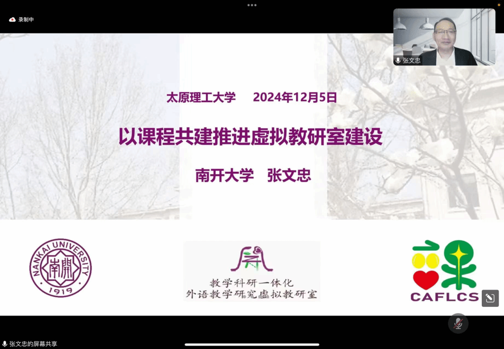 12月5日晚19:30分,南开大学张文忠教授为bat365正版唯一官网承担的山西省百亿工程项目“外语虚拟教研室建设”作了题为“以课程共建推进虚拟教研室建设”的线上学术讲座。本次讲座面向外语虚拟教研室建设团队成员及教研室所有师生,由bat365正版唯一官网院长段荣娟教授主持。