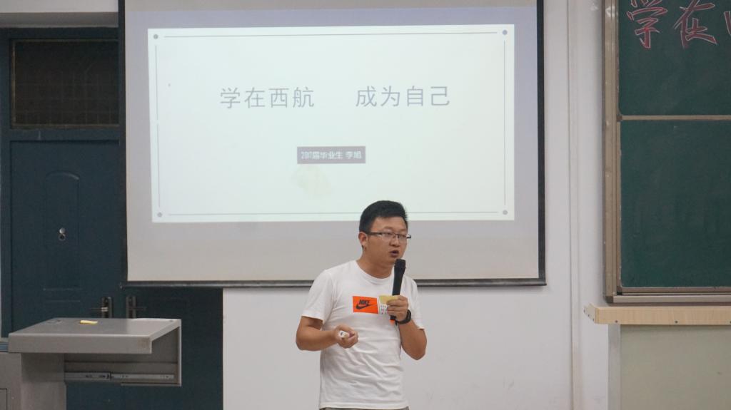 已经参加工作两年已久的李旭为大一同学们带来了他的西航学习生活和工作经历,他希望自己今天的分享可以让在座学生有所收获,并为传承“德能日新,刚健有为”的校训做出自己的贡献。首先他感慨道,四年的大学生活让他明白了太多,成长了太多,没有西航就没有今天的他!他以自己的大学生活经历告诉同学们他的精彩生活和对于自己的各种锻炼,在校期间,大一时他做了团学会干部,参加了多次暑假社会实践活动并多次去暑期见习。李旭从五个方面分享了自己的宝贵经验,一,大学重要的是学会自学,不仅要学会学习,同样要学会做人,同时在学习生活中做好规划,多思考。他引用竹子的故事告诉学生,学习是一个厚积薄发的过程,人生也是如此。二,学会独立是大学的必经之路,要过独立自主的学习生活,不再过分依靠别人。三,不要纠结选择想过的大学生活,不论是考研还是参加学生工作,社团,兼职,或者其它兴趣爱好,总之不能荒废时间,要一直锻炼自己。四,最宝贵的是时间,一定要学会时间管理,培养良好的工作习惯,合理安排周末和寒暑假。五,减少抱怨,想办法去解决问题,练就真本领,知行合一。最后李旭总结道,付出和收获永远成正比,如果不是,说明付出的还不够,越努力的人,才会越幸运,艰辛的大学生活不可悲,不要让你的大学成为一片空白。