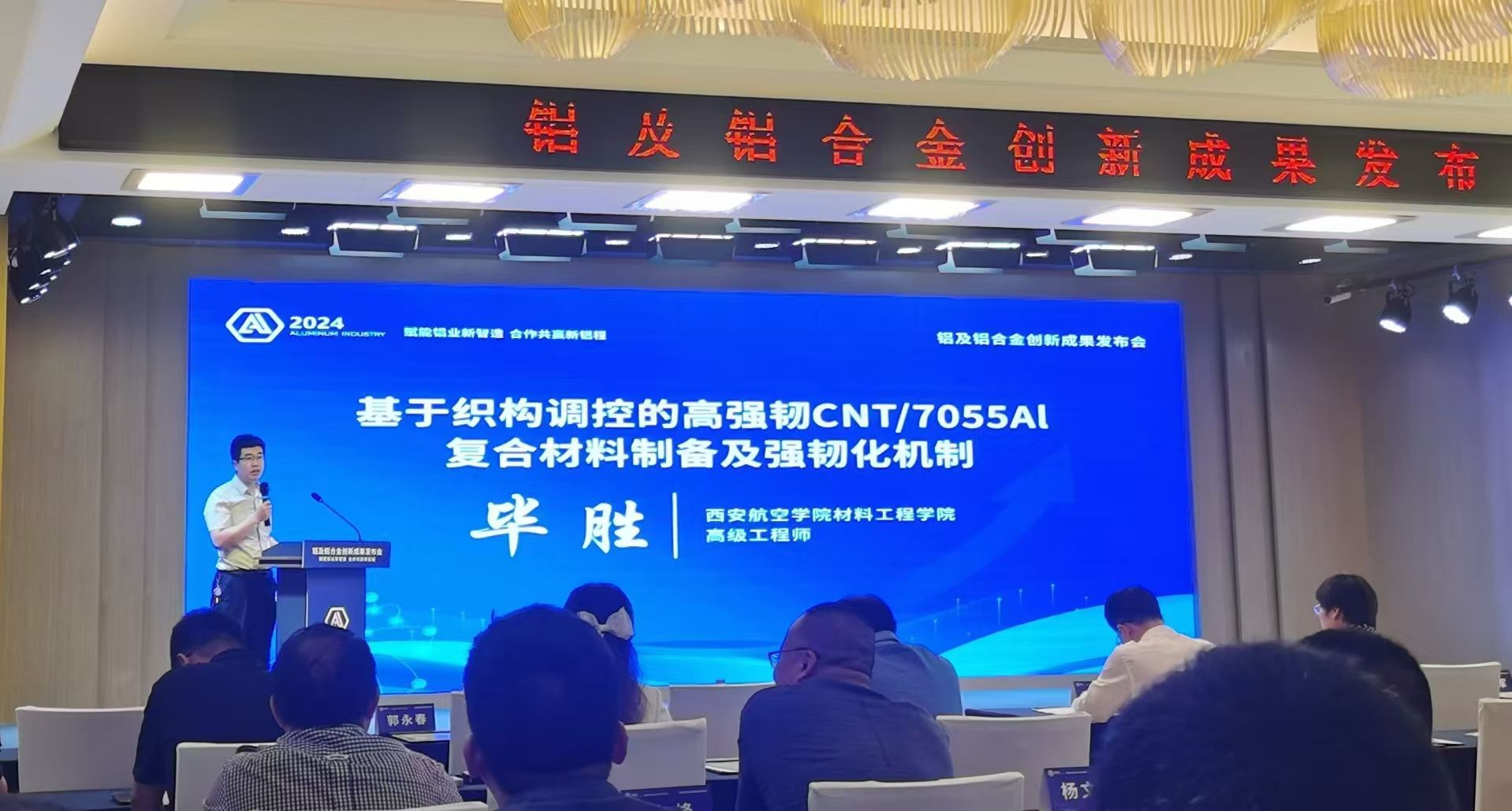 下午铝及铝合金创新成果发布会,会议由西安工业大学材料与化工学院院长杨忠主持,西安交通大学、西北工业大学、西安理工大学、西安工业大学、西安石油大学等高校教师以及企业代表汇报关于铝及铝合金的最新研究成果。在茶歇间隙各与会代表进行了深入的讨论和交流,铝合金成果发布会反响热烈。pp电子教师毕胜汇报了题目为《基于织构调控的高强韧CNT/7055Al复合材料制备及强韧化机制》的报告。会后,毕胜接受了铜川媒体记者的采访。